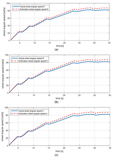 Estimation simulation result for wheel angular speed. (a) Wheel angular speed—fl (front left); (b) wheel angular speed—fr (front right); (c) wheel angular speed—rl (rear left); (d) wheel angular speed—rr (rear right).