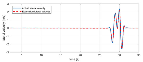 Lateral velocity can be calculated using the lateral acceleration and the yaw rate signal as shown in Equation (14) [31,32]. There is no lateral velocity sensor, but we used the equation to help understand the vehicle dynamics model used in residuals. For this reason, is also estimated using a dynamic model: