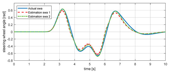Residuals 5 and 6, which were generated using Equations (19) and (20), are given in Equations (21) and (22) where is the steering wheel angle, is the steering ratio, and is the characteristic velocity of the vehicle [33,34]. For steering wheel angle estimation validation, we used scenario 2, shown in Figure 9. Figure 10 shows the validation simulation result of the sensor value with estimation values.