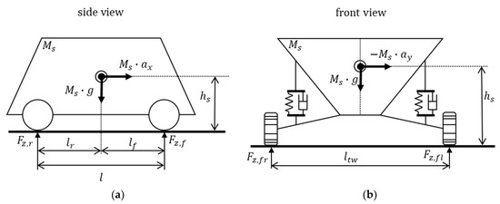 Figure 11a shows the vertical forces of the vehicle on the road from the side view. Figure 11b shows the vertical forces of the vehicle from the front view. The vertical force acting on each wheel can be calculated from Equations (23) to (26) by considering the weight shift according to the behavior of the vehicle when the longitudinal acceleration and lateral acceleration are known [35], where is the normal force, is the vehicle mass, is the gravitational acceleration, is the length of the rear wheel base, is the height from the ground to the mass center, and is the longitudinal acceleration of the vehicle.