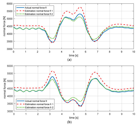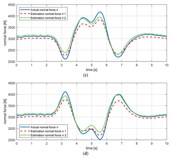 Estimation simulation result for the normal force. (a) Normal force—fl; (b) normal force—fr; (c) normal force—rl; (d) normal force—rr.