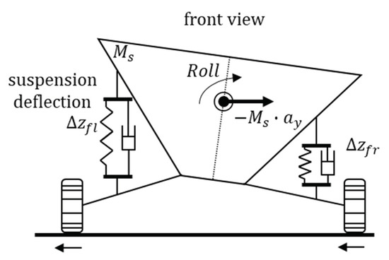 Figure 14 shows the roll angle scheme where is presented as in Equation (43). Assuming a flat road surface, we can consider the suspension deflection as shown in Equation (43), substituting it into Equation (44).