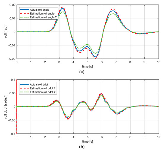 Estimation simulation result for the roll angle derivative of the roll rate. (a) Roll angle; (b) a derivative of the roll rate.