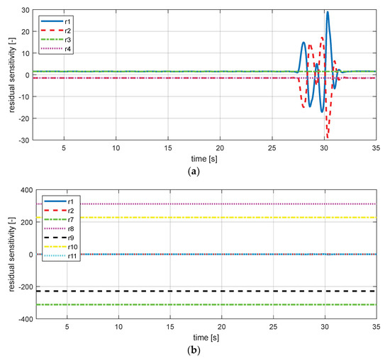 Table 6 presents the equations of residual sensitivity using the vehicle sensor signals. For the visualization of sensitivity, the simulation was conducted using scenario 1, which was presented in Section 3.1.