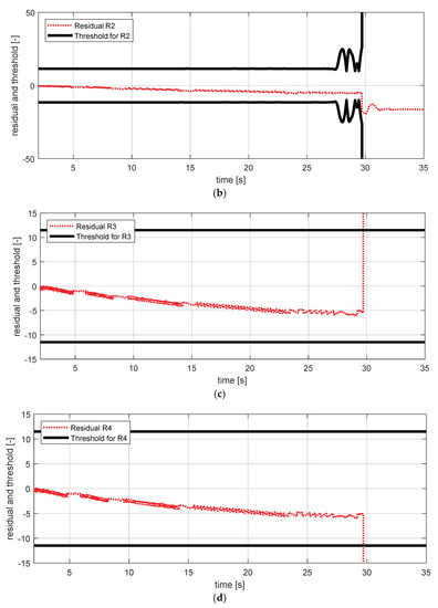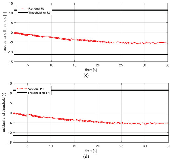 Therefore, residuals to for fault detection can be calculated by Equations (31) to (34).