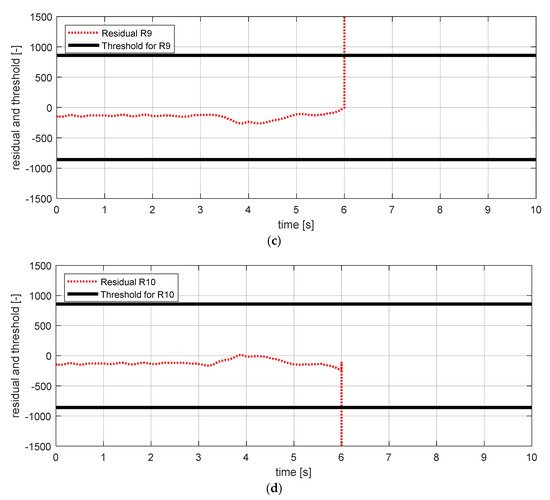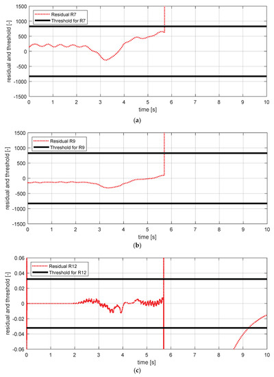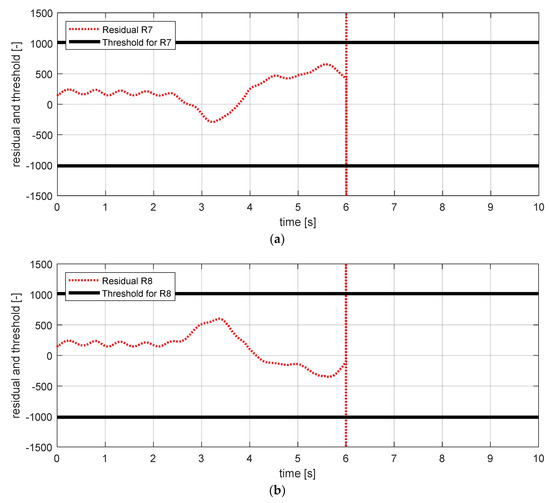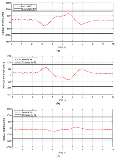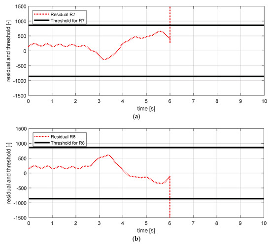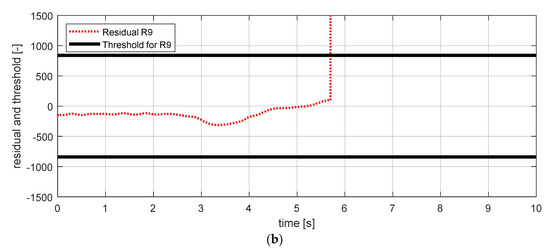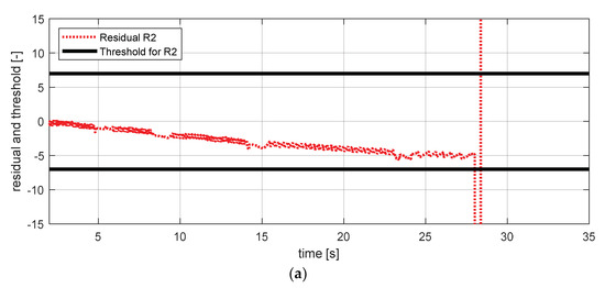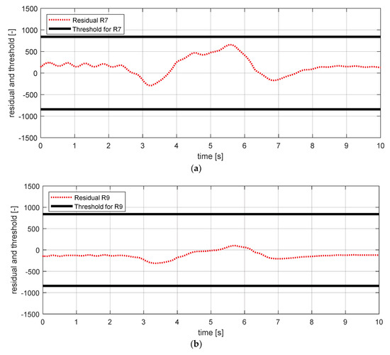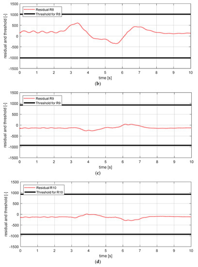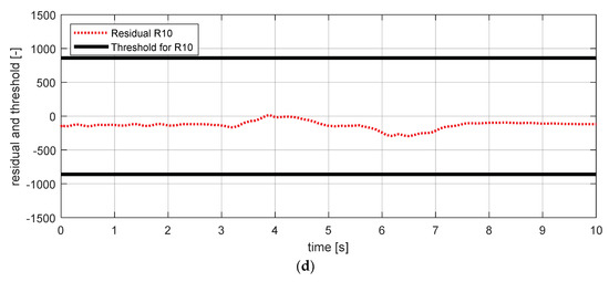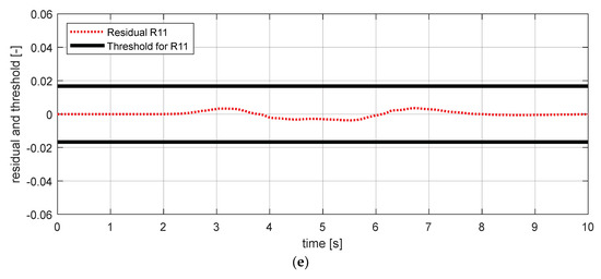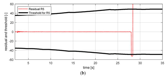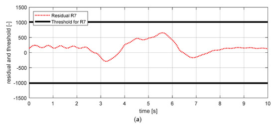 Figure 25 shows the experimental results in the normal situation with no fault and Figure 26 shows the simulation results in the case where the wheel angular speed sensor at the rear right failed. In Figure 26, residuals 4 and 5 exceeded their thresholds, as designed by their sensitivities. These results are consistent with the expected results from Table 7.