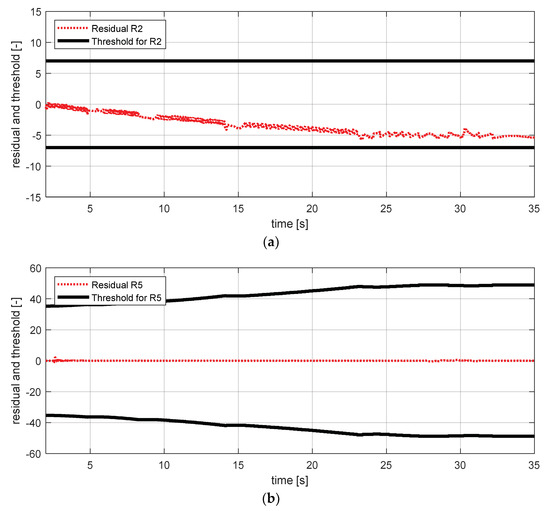 FDI simulation result for wheel angular speed sensor—fr (fault). (a) Residual 2 and threshold; (b) residual 5 and threshold.