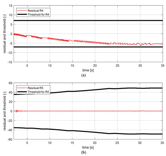 FDI simulation result for wheel angular speed sensor—rr (normal). (a) Residual 4 and threshold; (b) residual 5 and threshold.