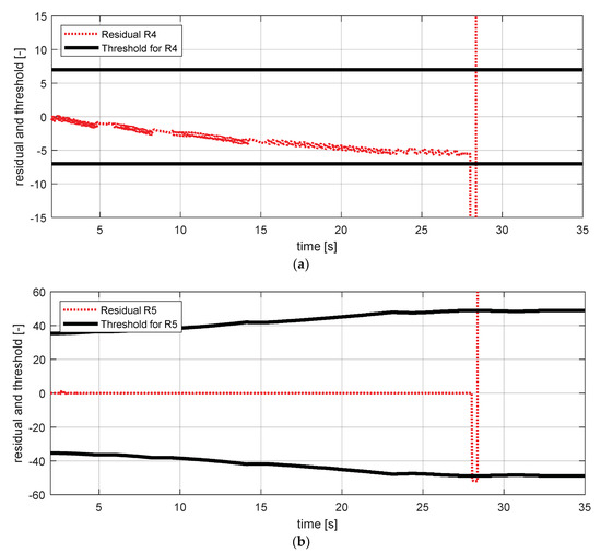 FDI simulation result for wheel angular speed sensor—rr (fault). (a) Residual 4 and threshold; (b) residual 5 and threshold.