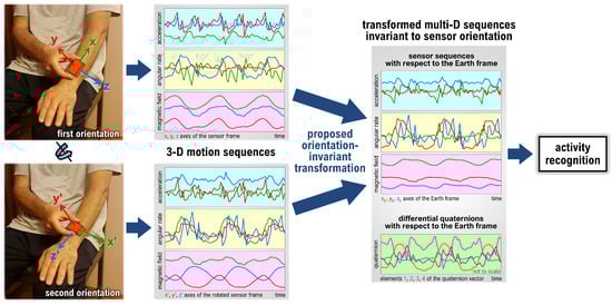 With the advancements mentioned above, placing wearable devices on the body properly has become a challenging and intrusive task for the user, making wearable devices prone to be fixed to the body at incorrect orientations. For instance, disabled, injured, elderly people or children whose health, state, or activities can be monitored using wearables [] tend to place the sensor units at incorrect or variable orientations. Mobile phones can be carried in pockets at different orientations. However, the majority of existing wearable activity recognition studies neglect this issue and assume that the sensor units are properly oriented or, alternatively, use simple features (such as the vector norms) that are invariant to sensor unit orientation. In this study, we focus on orientation invariance in a generic activity recognition framework. Our aim is to develop a methodology that can be applied at the pre-processing stage of activity recognition to make this process robust to variable sensor unit orientation, as depicted in Figure 1.