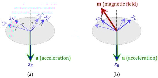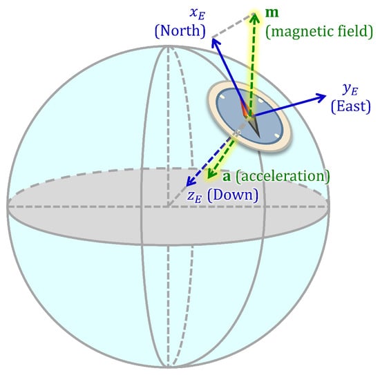 The acceleration vector acquired by an accelerometer approximately points in the down direction of the Earth frame, provided that the gravitational component of the total acceleration is dominant over the acceleration components resulting from the motion of the sensor unit. However, even if the acceleration vector consists of mainly the gravitational component, by itself it is not sufficient to estimate the sensor unit orientation because there exist infinitely many solutions to the sensor unit orientation, obtained by rotating the correct solution about the direction of the acquired acceleration vector (Figure 2a). Hence, we need to incorporate the magnetometer into the orientation estimation as well. The magnetic field vector acquired by a magnetometer points in a fixed direction in the Earth frame (the magnetic North) (Figure 2b), provided that there are no external magnetic sources or distortion and the variation of the Earth’s magnetic field is neglected.