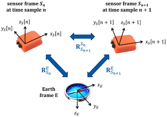 for each n as shown in Figure 4. The matrix is not invariant to sensor orientation because it represents the orientation of frame with respect to and depends on the orientation at which the sensor unit is fixed to the body. To observe this, let us assume that the sensor unit is placed at a different arbitrary orientation; that is, the sensor unit is rotated by an arbitrary rotation matrix that is constant over time. Then, the acquired data are for all n, represented with respect to the new sensor orientation , and the sensor unit orientation with respect to the Earth is estimated as for all n. Note that the original rotation matrix is post-multiplied by because describes a rotational transformation with respect to the sensor frame, not the Earth frame []. For the new sensor unit orientation, the rotation of the sensor unit between time samples n and can be calculated as