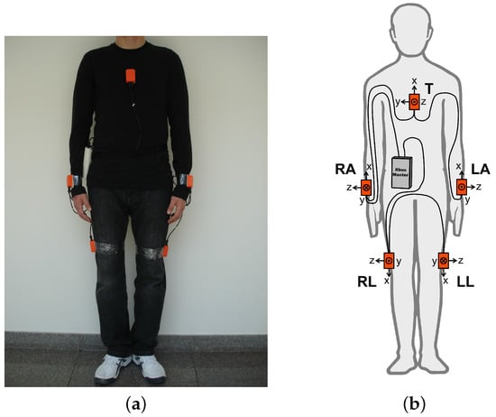 To demonstrate our methodology, we use the publicly available daily and sports activities dataset acquired by our research group earlier []. To acquire the dataset, each subject wore five Xsens MTx sensor units [] (see Figure 5), each unit containing three tri-axial devices: an accelerometer, a gyroscope, and a magnetometer. The sensor units are placed on the chest, on both wrists, and on the outer sides of both knees, as shown in Figure 6. Nineteen activities are performed by eight subjects. For each activity performed by each subject, there are 45 time-domain sequences of 5 min duration, sampled at 25 Hz, and consisting of 7500 time samples each. The dataset comprises the following activities: