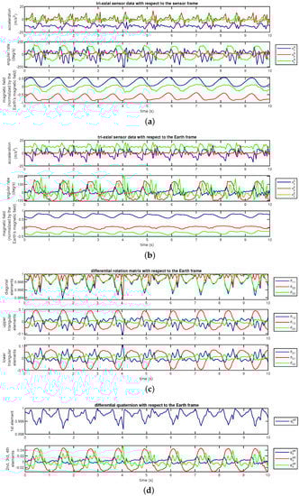- Proposed method: sensor sequences and differential quaternions, both with respect to the Earth frame: We calculate the differential rotation matrix with respect to the Earth frame for each sensor unit at each time sample n, as explained in Section 3.3. This rotation matrix representation is quite redundant because it has nine elements while any 3D rotation can be represented by only three angles. Since the representation by three angles has a singularity problem, we represent the differential rotation compactly by a four-element quaternion asWe have observed that the joint use of the sensor sequences and differential quaternions, both with respect to the Earth frame, achieves the highest activity recognition accuracy compared to the other combinations. Representing rotational transformations by rotation matrices instead of quaternions degrades the accuracy. Omitting magnetometer sequences with respect to the Earth frame causes a slight reduction in the accuracy. Activity recognition results of the various different approaches that we have implemented are not presented in this article for brevity, and can be found in [].Figure 7c shows the nine elements of the differential rotation matrix with respect to the Earth frame over time, which are calculated based on the sensor data shown in Figure 7a. Figure 7d shows the elements of the differential quaternion as a function of n. The almost periodic nature of the sensor sequences (Figure 7a) is preserved in and (Figure 7c,d). The differential rotation is calculated between two consecutive time samples that are only a fraction of a second apart, hence the amplitudes of the elements of and do not vary much. Since differential rotations involve small rotation angles (close to 0), the matrices are close to the identity matrix because they can be expressed as the product of three rotation matrices as in Equation (6) where each of the basic rotation matrices (as well as their product) is close to because of the small angles. Hence, the diagonal elements which are close to one and the upper- and lower-diagonal elements which are close to zero are plotted separately in Figure 7c for better visualization. When is close to , the vectors calculated by using Equation (7) are close to , as observed in Figure 7d.
