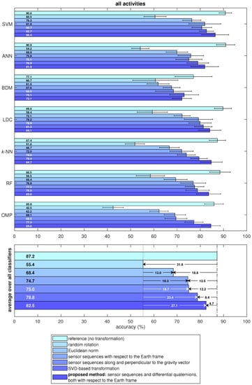 In the lower part of Figure 9, the accuracy values averaged over the seven classifiers are also provided for each approach and compared with the reference case, as well as with the proposed method. Referring to this part of the figure, the standard system that we take as reference, with fixed sensor orientations, provides an average accuracy of 87.2%. When the sensor units are randomly oriented, the accuracy drops by 31.8% on average with respect to the standard reference case. This shows that the standard system is not robust to incorrectly or differently oriented sensors. The existing methods for orientation invariance result in a more acceptable accuracy reduction compared to the reference case: The accuracy drop is 18.8% when the Euclidean norms of the tri-axial sensor sequences are taken, 12.5% when the sensor sequences are transformed to the Earth frame, 12.2% when the sensor sequences are represented along and perpendicular to the gravity vector, and 8.4% when the SVD-based transformation is applied.