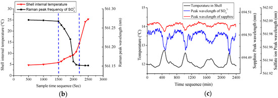 Effect of cabin temperature on Raman spectrum data. (a) Typical Raman spectrum and substance peaks. (b) Development trend of cabin temperature and SO42− Raman peak frequency (DOCARS system, #52 floating process). (c) Development trend among cabin temperature, Raman peak wavelength of sulfate ion and sapphire (OUC-Raman instrumental node).