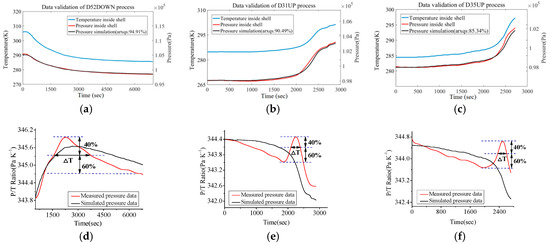 Data validation between real measurement group and predicted simulation group (Tc-P). (a) Comparison for diving profile measurement process of #52 ROV task. (b) Comparison for floating profile measurement process of #31 ROV task. (c) Comparison for floating profile measurement process of #35 ROV task. (d) Trend of P/Tc during diving profile process of #52 ROV task. (e) Trend of P/Tc during floating profile process of #31 ROV task. (f) Trend of P/Tc during floating profile process of #35 ROV task.