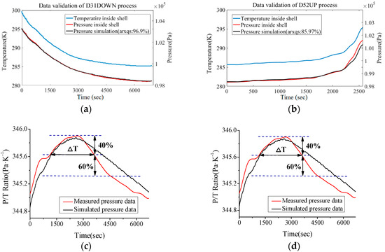 Data validation between real measurement group and predicted simulation group (Tc-P). (a) Comparison for diving profile measurement process of #31 ROV task. (b) Comparison for floating profile measurement process of #52 ROV task. (c) Trend of P/Tc during diving profile process of #31 ROV task. (d) Trend of P/Tc during floating profile process of #52 ROV task.