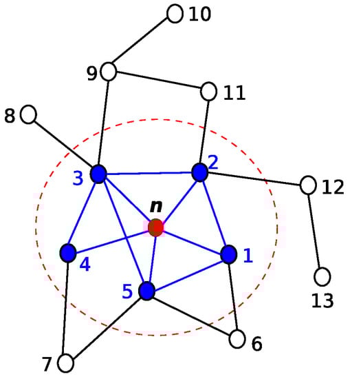 First of all, the definition of ego-networks is needed in order to understand the concept of egocentric centrality measures. By definition, an ego-network is a local subgraph consisting of a single node (ego) in addition to nodes that are connected to it (alters) and all the interconnection links among alters [,]. Figure 1 highlights a local subgraph where n represents ego and the one-hop neighbours (1, 2, 3, 4 and 5) denote the alters.