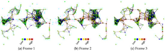To exemplify how each node behaves and how the network structure can change in a highly dynamic network scenario, in relation to the betweenness centrality score, a set of footprints that describe a frame sequence (Figure 3) was illustrated; see Figure 3a–c. It shows the behaviour of the network topology (or temporal graphs) through a heat map set of our experiment scenario that will be presented later. The density is 150 vehicles/km, and the transmission range is 200 m. Each node (or vehicle) is represented by a circle, and every communication link is represented by a bar. Moreover, each node can have five different colours according to the betweenness centrality score, ranging from low to high, as shown in Figure 3.