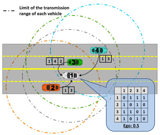Due to the high mobility of the vehicles in VANETs, getting all network topology knowledge is not an easy task. The egocentric betweenness measure is computed using only the available local knowledge; in that case, the adjacency matrix of one-hop neighbours. Each vehicle gets the local knowledge of the network topology by means of periodic beacon packets broadcast by its neighbours. The beacon transmission frequency employed was 1 Hz. Since the vehicle’s beacon packets are only useful to adjacent neighbours, the beacons received are not forwarded. Therefore, the information exchanged among vehicles is lists of neighbours, as illustrated in Figure 4. In this example with four vehicles, the grey vehicle (labelled as 1), receives the lists of neighbours of all vehicles that are currently within its transmission range (vehicles labelled as 2, 3 and 4). Once having received the lists, the vehicle constructs the adjacency matrix representation and calculates the egocentric betweenness score, according to Section 3.2. Each vehicle updates the egocentric betweenness score, whenever a new list is received.