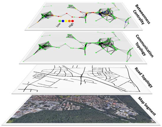 This work uses a distributed approach to perform the calculation of egocentric betweenness scores in vehicular networks. It consists of four stages, as depicted in Figure 5. For the sake of clarity, the figure is divided into four different layers (in a bottom-up fashion). The bottom layer represents the chosen map segment for the evaluation. The layer above it describes the road topology structure of that segment. The third layer shows the vehicle routes and the inter-vehicle communication produced in the simulation. Finally, the top layer depicts the egocentric betweenness calculation results. The next two sections describe the experimental settings (Section 5.1) employed in our simulations and the analysis of the simulation results (Section 5.2), respectively.