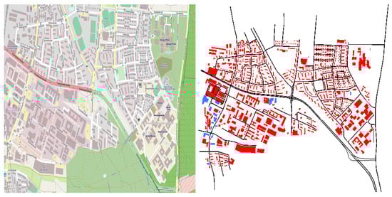 Map clipping from Erlangen, Germany. The figure on the left was imported from OSM and on the right represents the road topology used in our simulations.