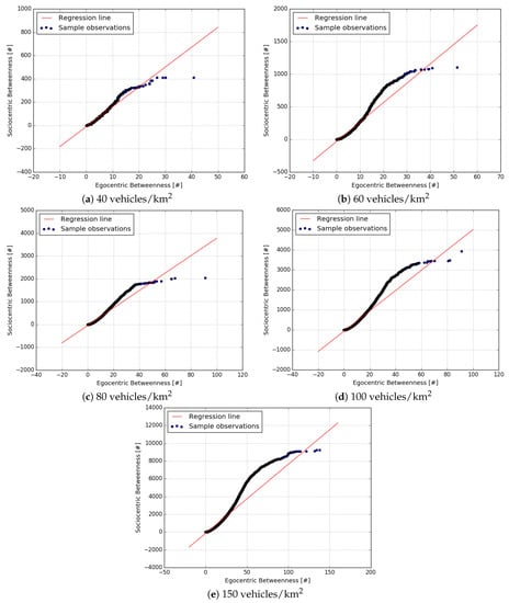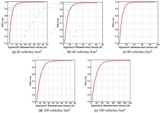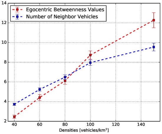 Inside the ego-network, the degree centrality of the nodes can be easily computed, as it is the number of direct connections of one node to its immediate neighbourhood. Because of that, it is possible to conclude that the degree centrality is similar to both egocentric and sociocentric network topologies. Incidentally, this same conclusion was reported by Wasserman and Faust []. On the other hand, the closeness centrality measure concerns the geodesic distances from a given node to all other nodes within the network. It is possible to notice that this measure requires the participation of all nodes involved in the network. Thereby, this measure cannot be directly applied in ego-networks, since all geodesic distances from the ego to other nodes are one-hop neighbours by definition, and this holds true because geodesic paths are no greater than two. Among the three measures presented in Section 3.1, the betweenness centrality measure is the most studied in several fields [,]. However, the literature lacks an investigation of this measure on VANETs.