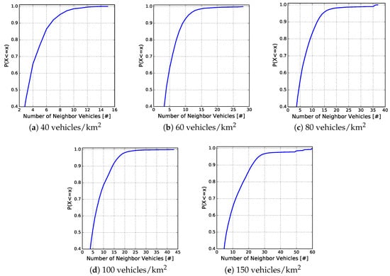 As for simulation parameters, each vehicle had a transmission rate of 6 Mbps, a transmission power of 0.98 mW, a receiver sensitivity of −82 dBm and a transmission range of 200 m. Channel 178 (control channel (CCH)) was used to exchange beacon packets, thereby excluding the effects caused by channel switching between the CCH and the SCH (service channel).