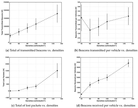 Figure 13a provides a macroscopic view of the total number of the beacon packets transmitted in each traffic density. For instance, in densities of 40, 60, 80, 100 and 150 vehicles/km, we had on average 49,000, 70,000, 90,000, 120,000 and 180,000 transmitted beacon packets, respectively. As can be seen, the beacon overhead increased linearly as a function of the traffic density, as expected. This expectation was well founded since as the density of vehicles increased, the higher the transmission rate of beacon packets into the network would be.