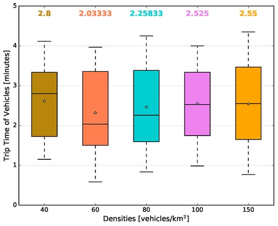 The microscopic view is depicted in Figure 13b, which shows the average number of beacon packets transmitted by each vehicle in each traffic density. When the experimental scenario had a density of 40 vehicles/km, each vehicle, on average, transmitted around 148 beacons during the simulation time; while, in the scenarios with 60 and 80 vehicles/km, on average, 134 and 138 beacons were transmitted, respectively. For 100 and 150 vehicles/km, there were, on average, 144 and 150 beacons transmitted by each vehicle, respectively. It is easy to see that the number of beacon packets transmitted, for each vehicle, is directly related to its trip time during the simulation time. With that in mind, Figure 14 depicts the average trip time of the vehicles during the simulation. It is possible to observe that in both of the aforementioned figures, the same behaviour appears in all the vehicle traffic densities. For example, in Figure 14, for the scenarios with 40 and 150 vehicles/km, the average trip times are higher than all other evaluated scenarios, reaching 2.8 and 2.55 min, respectively. On the other hand, the scenario with 60 vehicles/km presented the lowest average (2.0 min). These behaviours are following the same pattern as in Figure 13b, as well as the confidence interval.