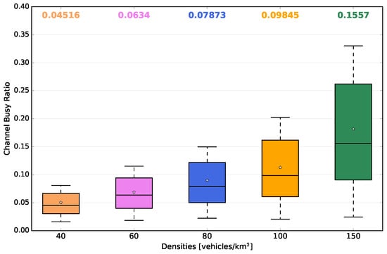 Figure 13c depicts the total number of beacon packets lost either by the fact that the communication channel was busy, or by errors in the received packets. As can be observed, the low densities (40 and 60 vehicles/km) presented a minimum packet loss rate. As the vehicle traffic density increased up to 150 vehicles/km, the total number of packets lost also increased. The observed behaviour was directly related to the channel busy ratio. Taking this into account, Figure 15 shows the average channel busy ratio for each vehicle traffic density. As the simulation time was set to 100 s, the calculation of the total busy time was nothing more than the channel busy ratio multiplied by the simulation time. In our case, for densities of 40 and 60 vehicles/km, the channel was busy for the shortest time, and as the density increased, the average time also increased. Even in the density of 150 vehicles/km, a maximum of 35% of channel availability was consumed. These results show that the beacon transmission frequency of 1 Hz was suitable, for this scenario, together with the mobility model applied, due to low channel utilization.