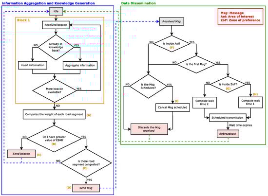 Figure 16 shows the operation flowchart of the proposed solution. The flowchart is divided into two phases. The first one is the information aggregation and knowledge generation, and the second is the data dissemination. In the first phase, every time the vehicle receives the local information, it either inserts or aggregates the local information into the local knowledge base (Block 1). In the next step, it calculates the weight of roads according to Equation (9) (Legend (A)). After this step, the vehicle with the highest EBM score (Legend (B)) classifies the weight of roads according to Table 5 (Legend (C)). During this process, if the selected vehicle detects some congested traffic flow, the knowledge is generated and distributed in the network (Legend (D)). On the other hand, if the vehicle does not have the highest EBM score, it selects the next most relevant vehicle and sends the aggregated local information to it (Legend (E)). The second phase (data dissemination), is responsible for informing vehicles that are inside an area of interest (AoI; Legend (F)) according to the application requirements. In addition, it also avoids the broadcast storm problem during the knowledge distribution process. Basically, to avoid this problem, a forwarder candidate suppresses the rebroadcast of low-priority candidates forwarders []. For this purpose, every time that a vehicle receives knowledge to be distributed, it checks if it is within the zone of preference [,] (Legend (G)), and if so, it transmits first (Legend (H)) because it has the shortest waiting time. Due to the broadcast suppression mechanism implemented (zone of preference), as soon as the neighbouring vehicles outside the zone of preference receive the same scheduled knowledge, they cancel the retransmission (Legend (I)), thereby avoiding the traffic of redundant knowledge in the network.