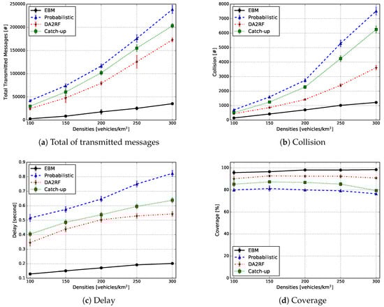Finally, EBM applies the egocentric betweenness measure to perform the selection of the most relevant vehicle, which will carry out the information aggregation and knowledge generation. In addition to that, it also uses the broadcast suppression mechanism in the knowledge distribution process. This combination enables it to outperform all other solutions in all the metrics evaluated. EBM significantly reduces the total number of messages transmitted, with an average decrease of more than 85% in comparison to the probabilistic approach, as well as 80% and 70% compared to catch-up and DA2RF, respectively (Figure 17a). As a consequence of this reduction, the knowledge generated can reach a larger number of vehicles in all densities analysed, resulting in a higher coverage rate, close to 98%, on average, as shown in Figure 17d. Furthermore, the broadcast suppression mechanism implemented has helped reduce the number of packet collisions (Figure 17b). The average reduction reached more than 75%, 70% and 50% compared to the probabilistic approach, catch-up and DA2RF, respectively. At the end, the EBM system also presented the lowest average delay, among all systems analysed, being around 0.15 s (Figure 17c).