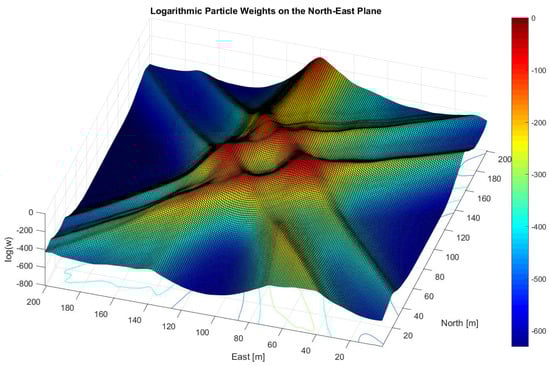 The last block (4) in Figure 1 refers to the navigation processor and thus to the implemented particle filter. There exist various types of particle filters—for example, Sampling Importance Resampling (SIR), Auxiliary SIR (ASIR) or Regularized Particle Filter (RPF). The details of these filters are not further discussed in this work, but all of them rely on a proper particle weight update. The particle weight update function determines the weight change of each PVT particle and takes the MC values as input. Afterwards, the final PVT solution (yellow circle in 4) is computed by constructing a probability density function using the particle weights and calculating the final PVT solution using a weighted mean over all particles. To illustrate the implementation, Figure 2 depicts the normalized logarithmic particle weights  from Equation (35) using the optimal particle weight update from Equation (34) but without information from the previous epoch . Thus, there is no influence from the past and the figure shows the results from one epoch only. In contrast to it, Figure 3 shows an improper aligned clock error where the GNSS signals do not overlap in the position domain.