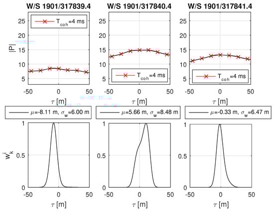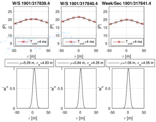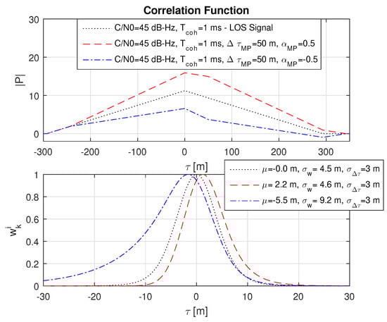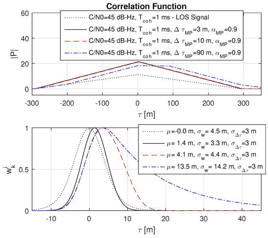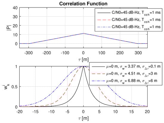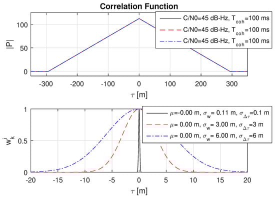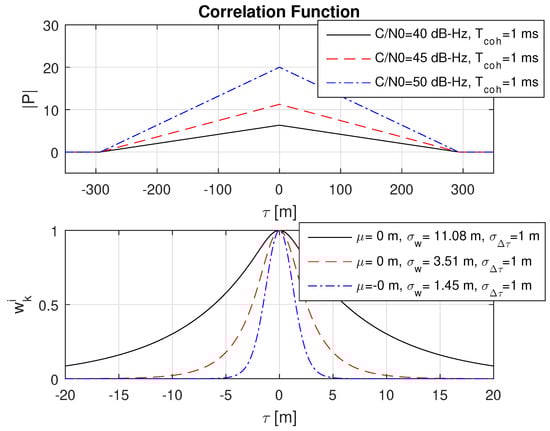 The plot is based on a MATLAB [] simulation (Release 2015b, The MathWorks Inc., Natick, MA, USA). The upper plot shows the correlation function from Equation (15) for different coherent integration times at a C/N0 = 45 dB-Hz. The simulated signal was generated without noise (i.e., the C/N0 merely defines the correlation amplitude). The lower plot shows the corresponding probability function after one weight update Equation (36), for one signal  and assuming a uniform distribution from the previous epoch, i.e.,  is considered in Equation (34). The statistics in the lower plot refer to the weighted mean  and weighted standard deviation .