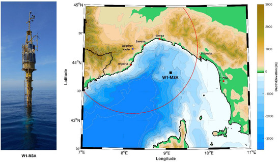 The surface buoy of the W1-M3A observing system and the map of the Ligurian basin. The square at the center of the basin marks the position of the W1-M3A observing system, the circle shows the operational range of the weather radars in the Liguria region used in the analysis.