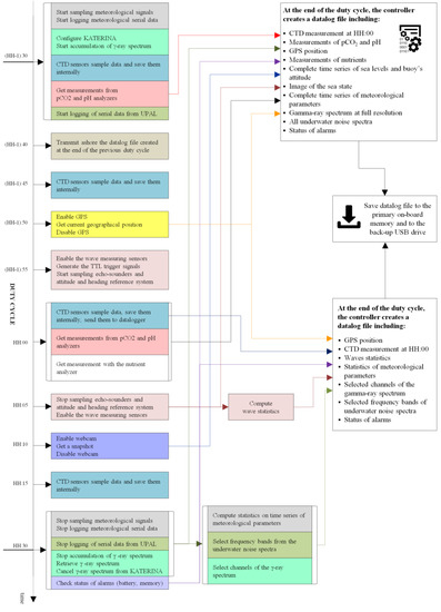 As soon as the executable program starts, the controller gets several parameters of configuration from an initialization file stored locally: the calibration coefficients of the sensors, the duration of the duty cycle, the scheduled start-up time or period for each instruments or group of homogenous of sensors, the sampling frequency for each input analogue channel and the parameters related to the data transmission (i.e., frequency of outgoing call, allowed phone numbers of the receiving station ashore, maximum number of files that can be transmitted for each call, etc.). Once the configuration phase is completed, the program operates uninterruptedly.