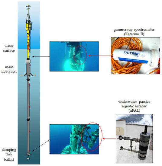 Sketch of the surface buoy of the W1-M3A observatory and images of the deployed sensors: the gamma-ray spectrometer at 6 m depth and the underwater passive aquatic listener close to the damping disk of the buoy at about 36 m depth.