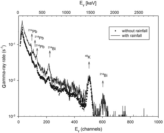 The KATERINA II sensor provided one spectrum every hour and two types of calculations were performed in an automated way: (a) gross gamma-ray rates were measured by summing the counts in the whole energy range (10–2700 keV) and dividing by the acquisition time in seconds (3600 s), and (b) counting rates in ROI obtained by summing the counts in the energy region of 351 keV for 214Pb, 609 and 1764 keV for 214Bi and dividing by the acquisition time. The quantification of the radioisotopes activity concentrations requires the analysis of the obtained spectra either manually using available software [33], or using dedicated automated algorithms [34]. Also, in order to obtain statistically acceptable results, given the short acquisition time (3600 s), grouping and summation of several spectra may be needed following appropriate analysis approaches [35]. Although quantification as well as association of activity concentrations with meteorological parameters are future tasks—out of the scope of the present work—for the sake of completeness, two typical gamma-ray spectra acquired during periods with and without rainfall are depicted in Figure 5. The first spectrum (depicted by dots) represents an indicative spectrum obtained during dry periods. The short acquisition time and the low activity concentration of radon progenies in the open sea, result to spectra of poor statistics, thus this spectrum was prepared by summing several hourly obtained spectra followed by appropriately time normalization. The spectrum depicted by the straight line was obtained during the storm on 10 of October 2016 with an acquisition time 3600 s. In the first one, the photo-peak corresponding to 40K dominates, as potassium generates the enhanced continuum of Compton background in the range 10–1460 keV. Slight photopeaks attributed to radon progenies can be observed in the energy regions of 352 and 609 keV (214Pb and 214Bi) attributed to background traces of lead and bismuth contained within the material of the station’s structural frame. After a rainfall event, several photopeaks attributed to radon progenies can be observed. More specifically, photopeaks of 214Pb are observed at the energies of 241, 270 and 351 keV and of 214Bi at the energies of 609 and 1764 keV.