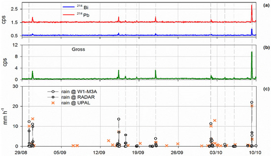 (a) Counting rate measurements of gamma-rays attributed to the radon progenies 214Pb and 214Bi; (b) Total detected gamma-rays; (c) Rain measured by the rain-gauge on the observatory, the weather radars and estimated by UPAL.
