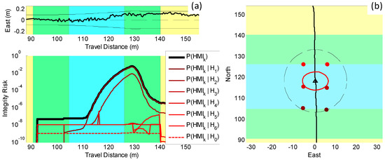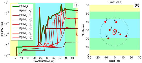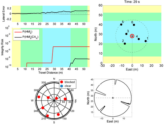 To explain this sudden jump, the top right-hand-side (RHS) chart in Figure 2 shows that, at the travel distance of 29 m (i.e., at travel time = 29 s) corresponding to the large increase in predicted integrity risk, landmark “1” was hidden behind landmark “4”. To the LiDAR, landmark “1” became visible again at the next time step, which made correct measurement association with either landmark “1” or “4” extremely challenging. The bound accounted for the risk caused by such events. This is consistent with other results presented in [1,26,27,28].