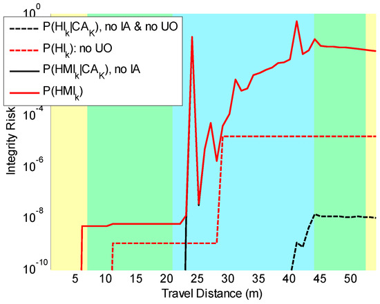 In Figure 3, the risk of having a UO occluding a landmark is taken into account. Our new integrity risk evaluation method was implemented. We could quantify the impact on P(HMIk) of undetected UOs assuming systematic CA by measuring the difference between the dashed black line derived using [28] and the solid black line . We noticed again that (directly derived from the EKF covariance) was a poor safety metric because it stayed below , whereas , accounting for UOs, exceeded . In parallel, the red curves account for the risk of incorrect association (IA). The difference between the dashed red line and the solid red line, which respectively reached and above , shows the impact on P(HMIk) of undetected UOs.