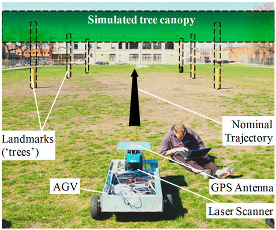 Experimental setup of a forest-type scenario, where a GPS/LiDAR-equipped rover is driving by six landmarks (cardboard columns) in a GPS-denied area. GPS is artificially blocked by a simulated tree canopy and a precise differential GPS solution is used for truth trajectory determination.
