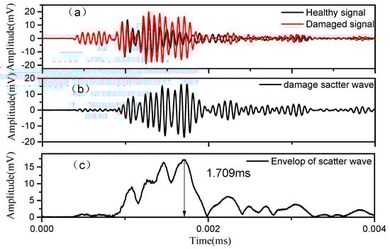 Time-domain Lamb wave signals in experiment: (a) healthy and damaged signal; (b) damage scatter wave; (c) envelop of scatter wave.