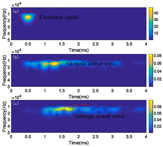 Figure 5 shows the wavelet energy spectrum of a series of Lamb wave signals after using WT. Db10 is adopted as wavelet function. The time-frequency distribution of the arrival wave and damage-scatter wave can be clearly seen in Figure 5b,c. The ToF of scatter wave is sensitive to the insulation damage position. In detail, the procedure to extract ToF of scatter wave is: at a center frequency of 15 kHz, the time at which the wavelet spectrum of scattered wave in Figure 5c reaches the maximum value is determined as the arrival time (1.716 ms). The beginning time of the excitation wave is derived as 0.500 ms from Figure 5a, similarly. The corresponding ToF (1.216 ms) is the time delay between the arrival time (1.716 ms) and the beginning time (0.5 ms).