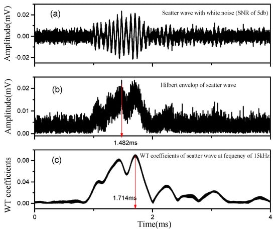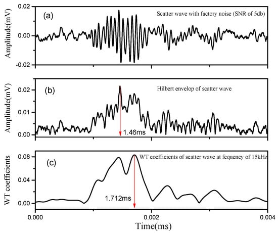 Then, noise robustness of the WT and HT method for ToF extraction is compared in the experiment. Figure 6 and Figure 7 show the ToF extraction results when the scatter wave is added with additive Gaussian white noise (AGWN) and factory noise (FN), respectively. The SNR in the two cases is both 5 db. In Figure 6, the arrival time of scatter wave determined by the HT method is 1.482 ms, while it is 1.714 ms by WT method. In Figure 7, the arrival time of scatter wave by HT and WT method are 1.460 ms and 1.712 ms, respectively. The HT method shows a nearly 0.2 ms deviation of ToF extraction under a noisy environment. In contrast, the WT method presents quite a high consistency even though the scattered wave signals are severely polluted.