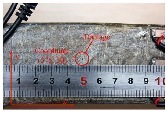 To identify punctures in stator insulation by the proposed method, an insulation puncture damage with a depth of 6 mm and diameter of less than 1 mm was artificially made at coordinate (375, 30) of a 1200 mm length stator bar, as shown in Figure 8.