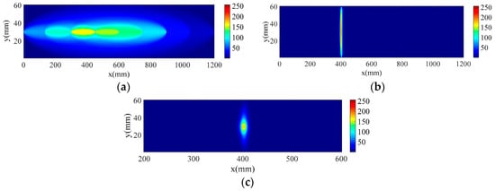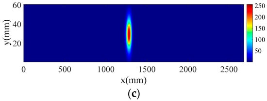 Similar with the damage imaging procedure of puncture damage described above, the global PDI was first applied, and the corresponding imaging result is shown in Figure 11a. Then local PDI was conducted, and the imaging result is shown in Figure 11b. Image fusion was performed and the ultimate imaging result is shown in Figure 11c. From the image construction results, crack insulation damage was identified at coordinate (1293, 29). Compared to the actual damage position of (1280, 30), the location error in x-direction is 13 mm, presenting good damage location precision. The identification result of crack insulation damage in Figure 11 shows that not only the insulation damage location, but also the geometrical shape of the crack insulation damage can be identified in an intuitive and graphical manner.
