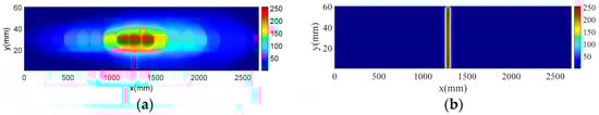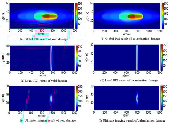 Figure 13 shows the imaging results of the inner void and delamination damage in FEM simulation by the proposed hierarchical PDI method. The existence and location of inner void and delamination damage in stator insulation can easily be identified. The identified inner void and delamination damage was located at (780, 29) and (800, 27), respectively. Location identification errors of void and delamination damage are 45 mm and 25 mm in x-direction, respectively. Considering the length of stator bar (1200 mm), these identification errors are quite acceptable.